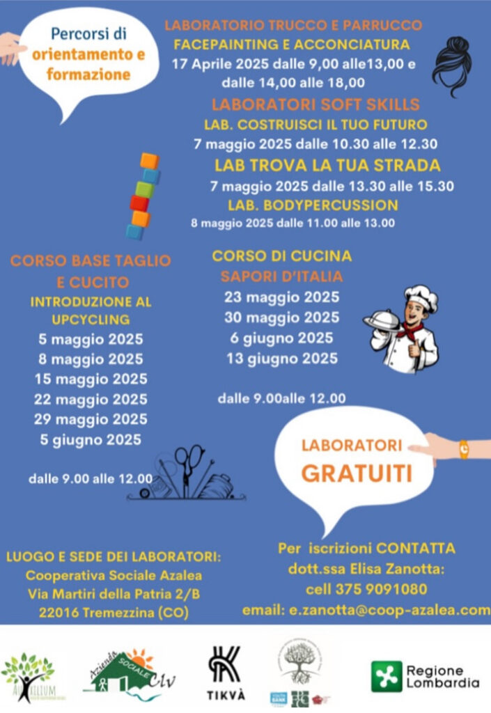 Se hai meno di 35 anni e vorresti trovare una nuova ispirazione, potrai partecipare ad alcuni laboratori gratuiti che si svolgeranno nella nostra sede in Via Martiri della Patria 2/B (Tremezzina):