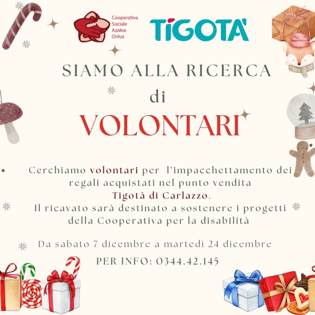 Siamo alla ricerca di volontari per l’impacchettamento dei regali acquistati nel punto vendita Tigotà di Carlazzo. I giorni saranno da sabato 7 dicembre a martedì 24 dicembre, dalle 10 alle 18 spezzando in due o tre parti la giornata.
