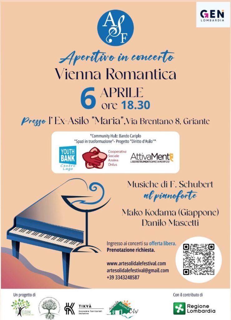 Domenica 6 aprile vi invitiamo al secondo appuntamento di “Aperitivo in concerto” di Arte Solidale Festival, presso la nostra sede in Via Brentano 8, (Griante) questa volta dedicato a Franz Schubert, in collaborazione con l’artista giapponese Mako Kodama accompagnata da Danilo Mascetti.